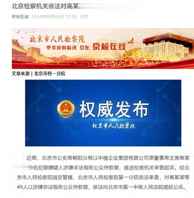 近期,北京市公安局朝阳分局以中植企业集团有限公司原董事局主席高某某等49名犯罪嫌疑人涉嫌非法吸收公众存款罪,移送检察机关审查起诉。经北京市人民检察院指定管辖,北京市人民检察院第一分院依法审查,对高某某等49人以涉嫌非法吸收公众存款罪,依法向北京市第一中级人民法院提起公诉。