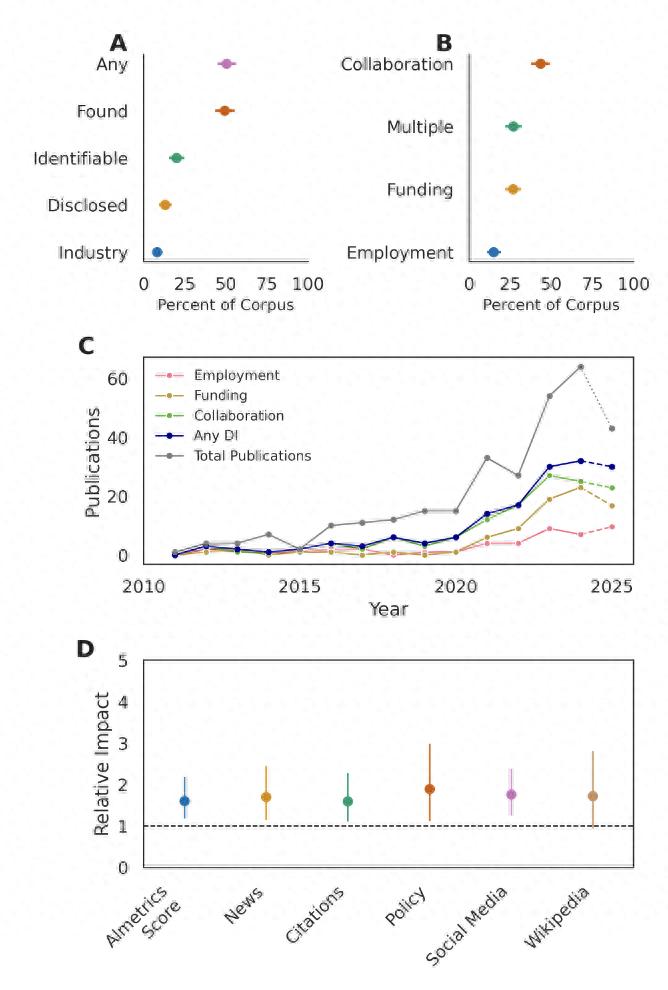 研究发现,仅有 20% 的论文在某处提及了产业联系,但独立核查显示 49% 的论文存在可披露联系,实际披露率不到应披露数量的一半。在 227 篇明确声明“作者无利益冲突”的论文中,有 42% 实际上存在可披露的产业联系。