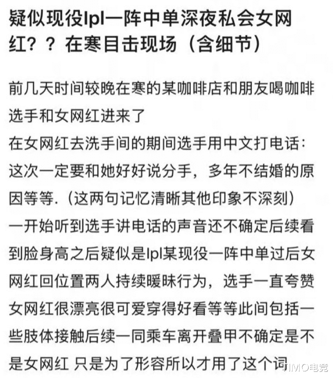 就在分手官宣前,网络上早已暗流涌动,一则“LPL顶尖中单私会女网红”的匿名爆料疯传,矛头直指Rookie,为这场分手蒙上了一层阴影。爆料称该选手在韩国私下约会女网红,通话中更是提及分手事宜,种种细节与Rookie的行程高度吻合,瞬间引发网友猜忌。