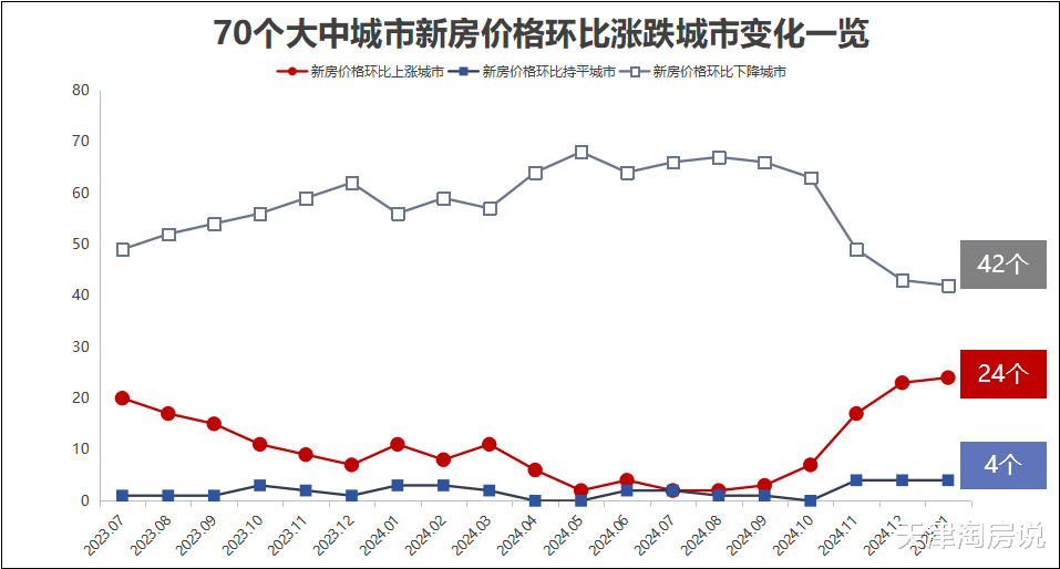 1月份,70个大中城市中,新房价格环比上涨的城市有24个。