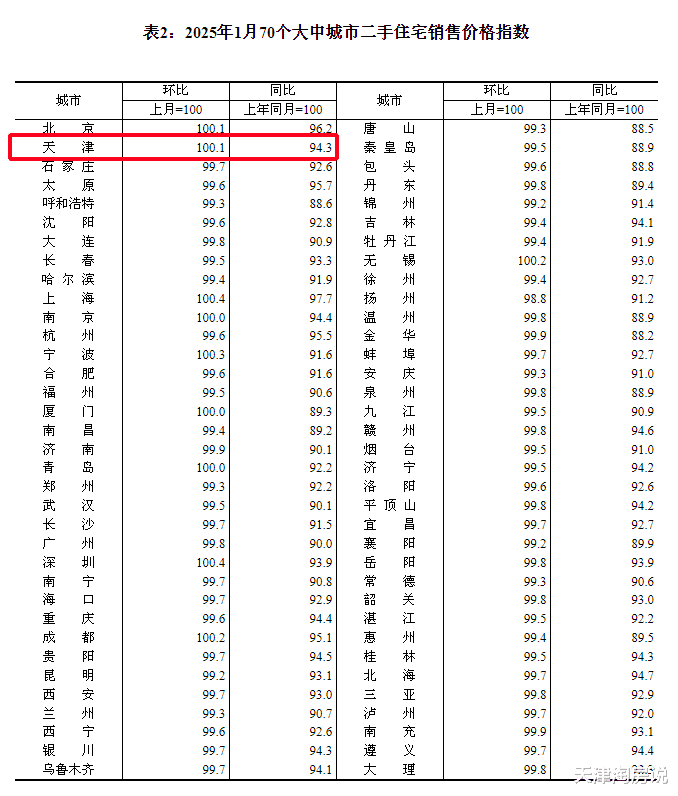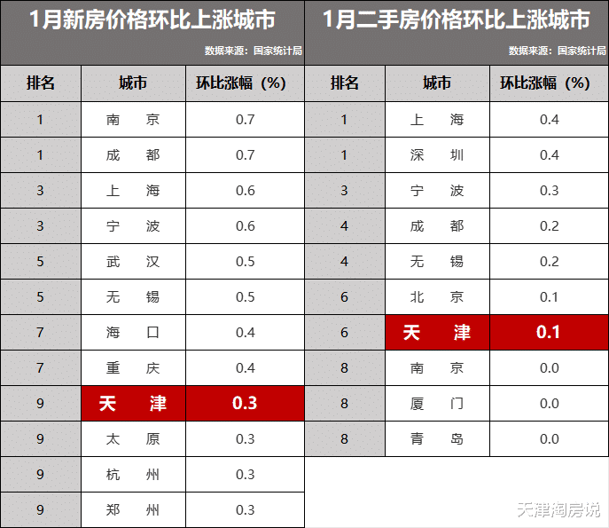 国家统计局数据,1月天津二手房价格环比上涨0.1%。