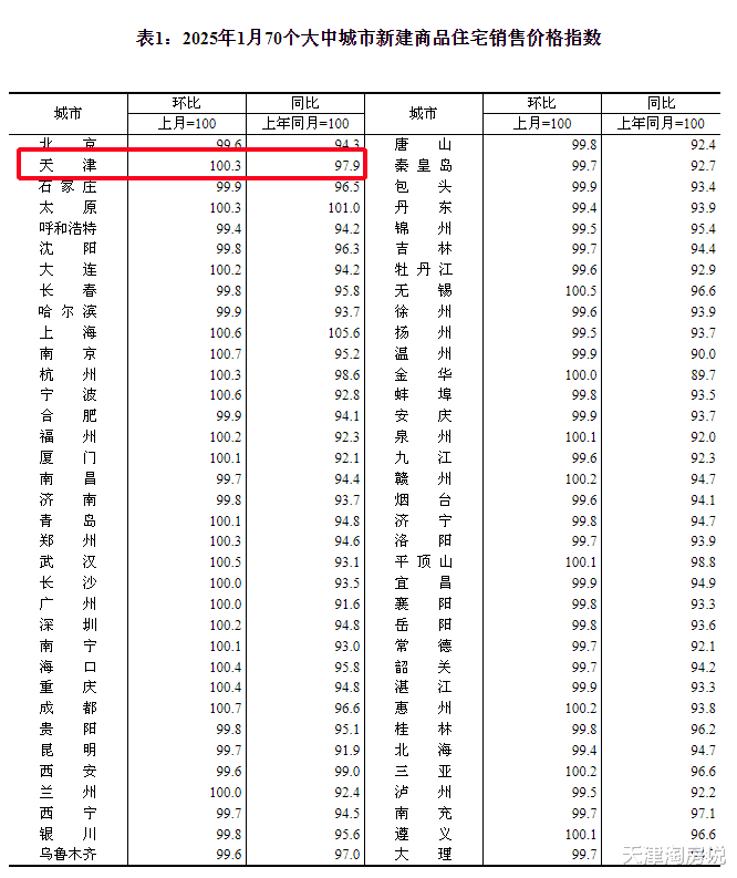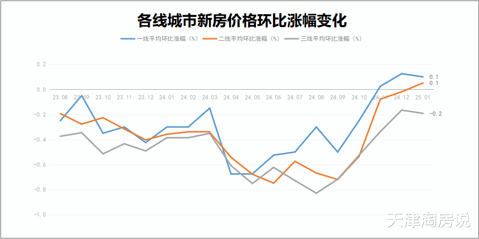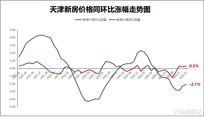 国家统计局数据显示,2025年1月,天津新房价格环比上涨0.3%,同比下跌2.1%。