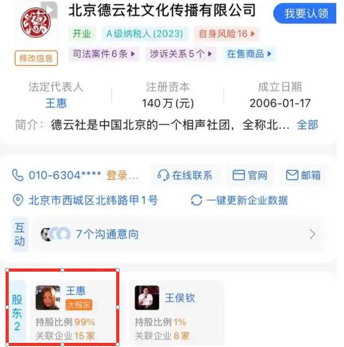 企业控制权方面,王惠牢牢掌握着德云社99%的股份。天眼查数据显示,剩余1%股份由王惠堂弟王俣钦持有,他同时担任岳云鹏的经纪人。德云社旗下多家关联企业的负责人也多为王惠亲属,形成了严密的"家族式"管理体系。