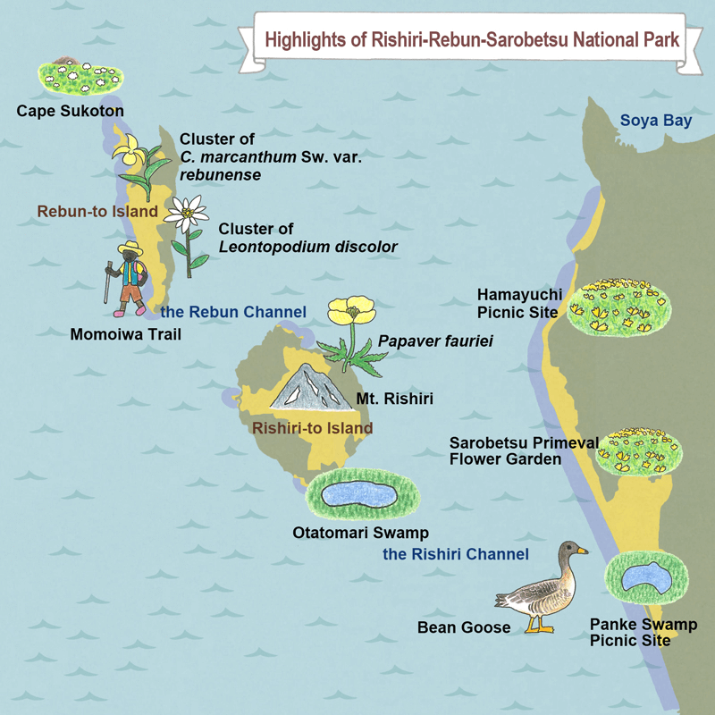 利尻礼文佐吕别国立公园由利尻岛、礼文岛、佐吕别原野三大区域所组成,景观十分多元,诸如山岳、花田、海蚀崖、湿地、海岸沙丘等,都可以在这里见到。