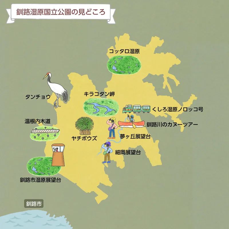 钏路湿原国立公园由流经北海道东部的钏路川,与其支流流经的日本最大湿地——钏路湿地,以及环绕湿地的丘陵所构成。