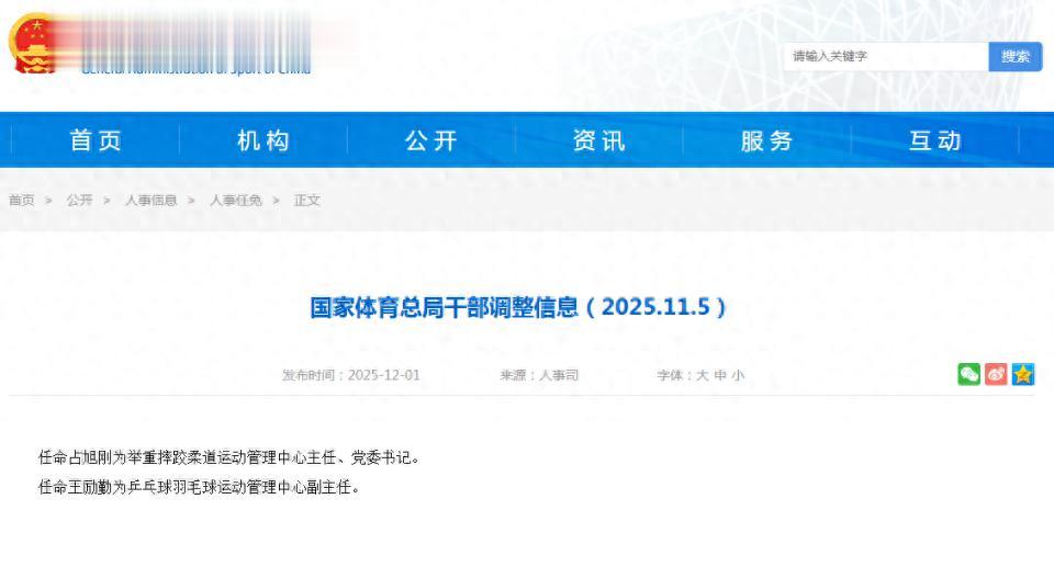 2月1日,据国家体育总局官网: 任命占旭刚为举重摔跤柔道运动管理中心主任、党委书记。 任命王励勤为乒乓球羽毛球运动管理中