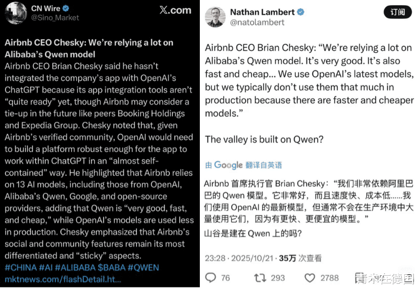 爱彼得CEO在采访中就指出,公司正在大量依赖阿里的千问模型,因为它比Open AI的模型更好用、更出色。