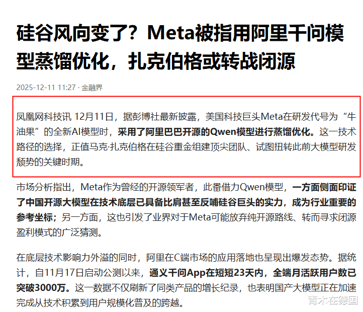 12月10日,彭博社消息称,曾经的全球开源霸主Meta新模型“牛油果”项目,选择了蒸馏中国阿里千问开源模型。
