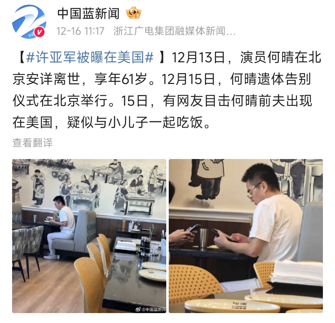 12月16日,媒体“中国蓝新闻”爆料,称何晴遗体告别仪式在北京举行当日,前夫许亚军疑似没出席告别仪式。