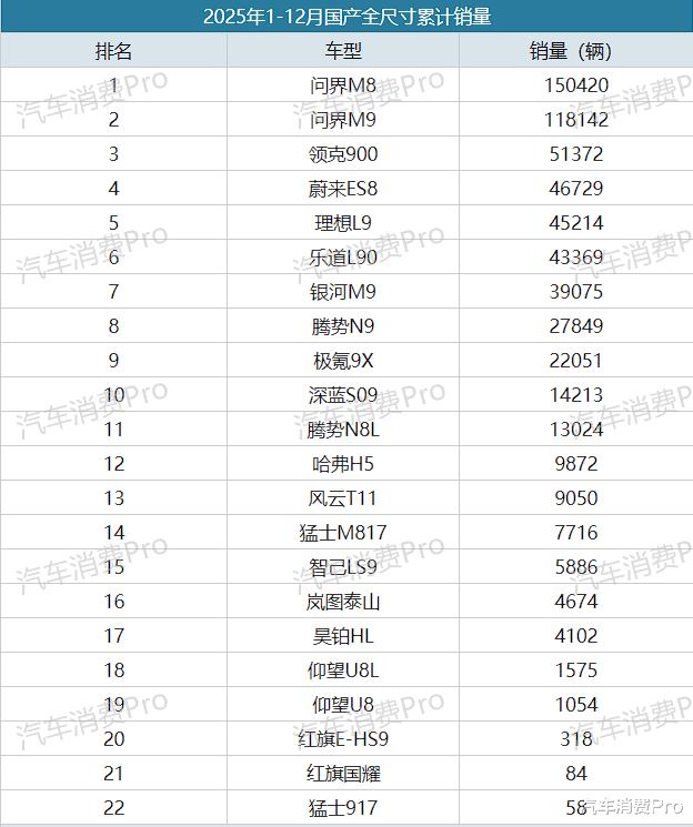 从全年销量来看,今年4月份上市的问界M8成为国产全尺寸的大赢家,其2025年累计热销150420辆,成为2025年国产全尺寸SUV销量冠军;同品牌的问界M9以118142台辆的成绩拿下亚军,在这个细分市场,也仅有这两台车年销超过了10万台。