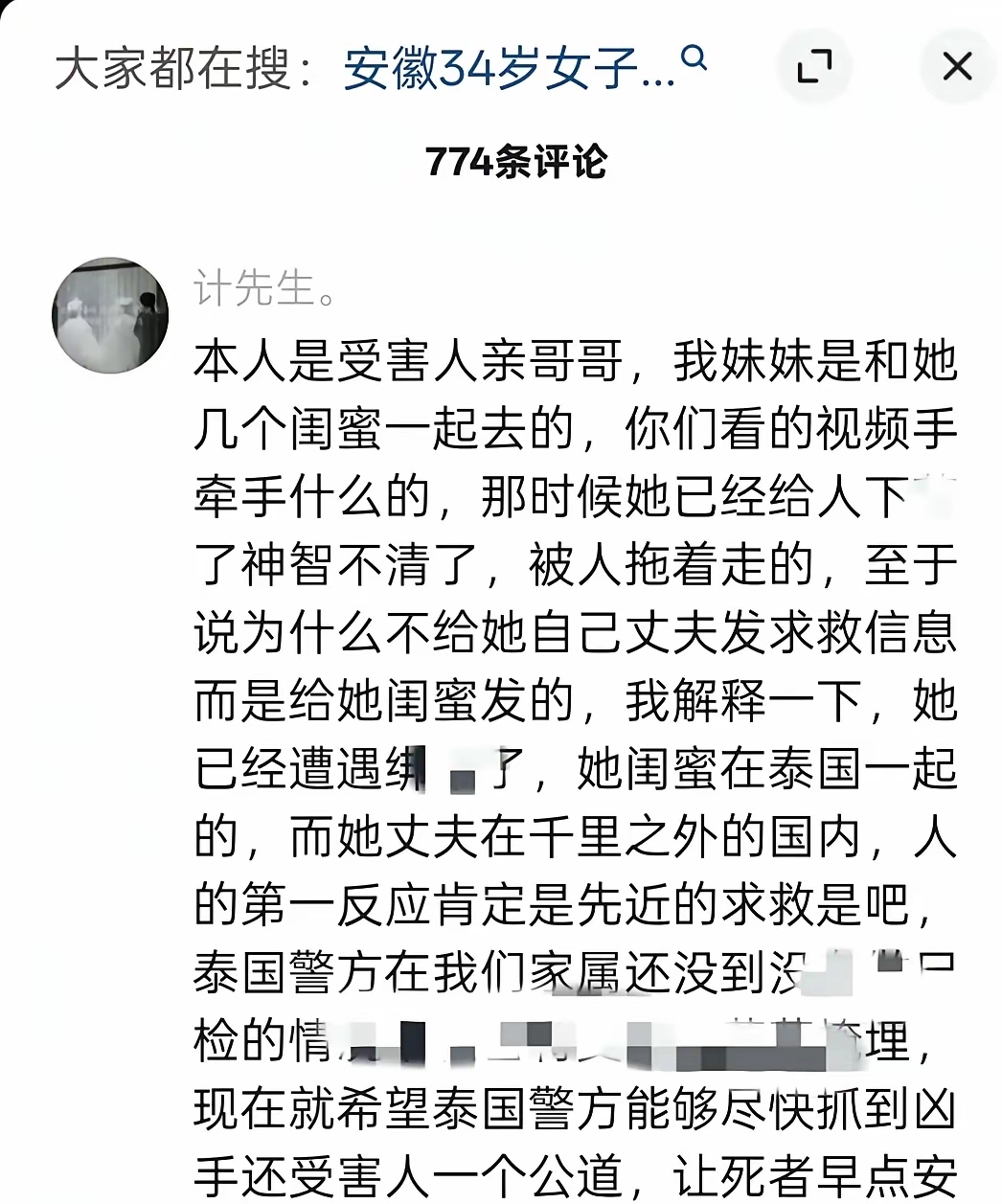 除了这个疑点之外,女子的哥哥还在评论里面解释,为什么妹妹发信息给闺蜜不给丈夫,因为闺蜜也在泰国,远水救不了近火。