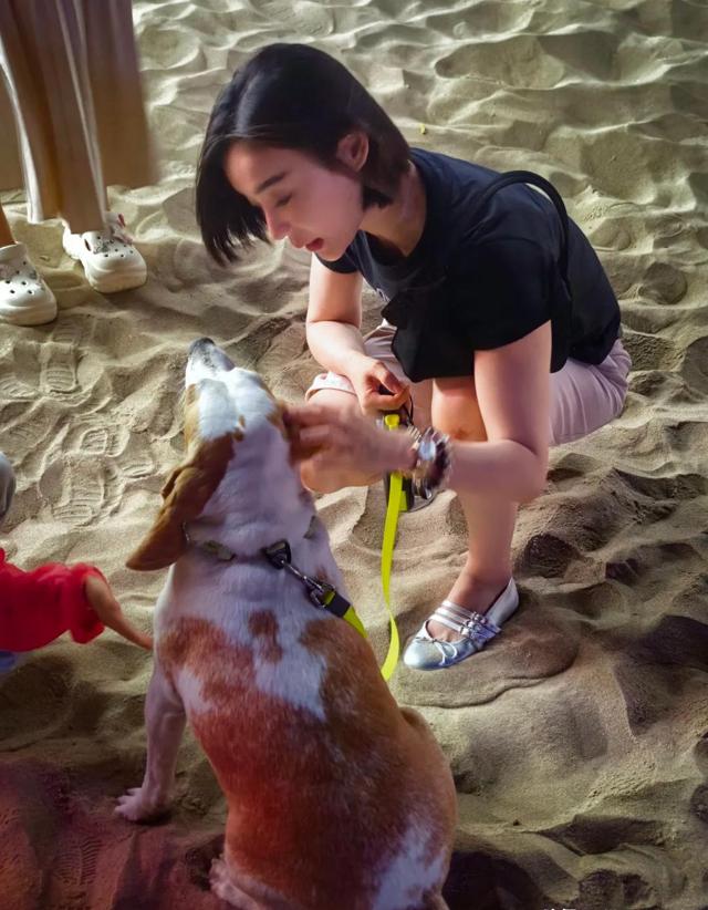在沙滩上,袁姗姗一边拉着狗绳,一边用手摸着狗耳朵,而即使旁边围了很多人,她也一点都不在意,而是继续着自己的事。