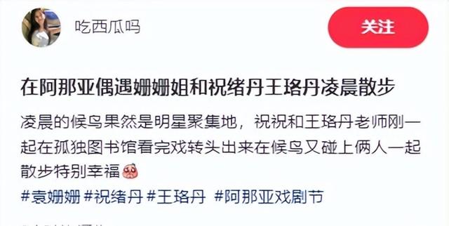 再看另一张照片,王珞丹手里端着杯子,正扭头和祝绪丹说着什么,而祝绪丹则继续大摇大摆的走着路,像是没听到一样。