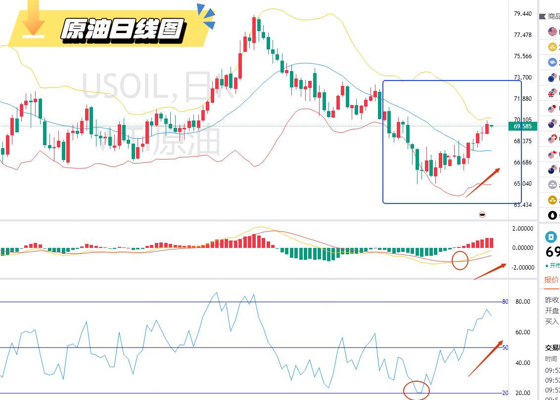 从原油日线图来看,目前我们的原油处于一个上涨的趋势,布林带已出现了向上行走趋势的信号,烛线图也是穿过了布林带的中轨贴近了布林带的上轨,MACD指标中的快慢线也已出现了金叉的现象,能量柱明显的从负值区走向了正值区,RSI指标在触碰到超卖去之后开始反弹向上。