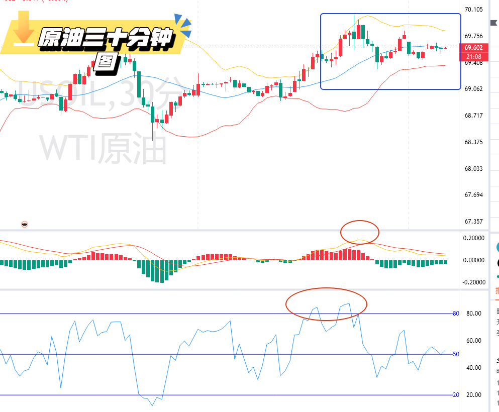 从原油三十分钟的图来看,布林带在出现了收口又开后的现象之后又再次出现了收口的现象,烛线图也开始出现了一个震荡的现象,MACD指标中的快慢线在出现了死叉之后能量柱开始处在了负值区,RSI指标在出现了两次超买区之后又降回。