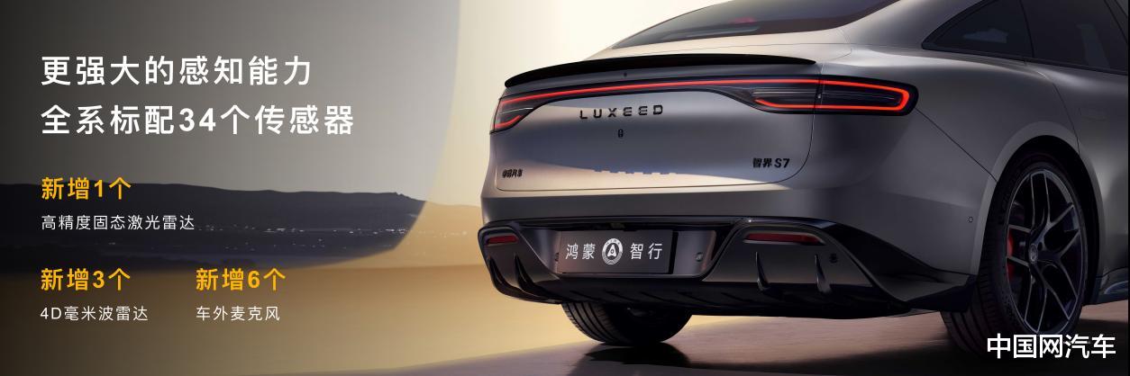 智界S7新款新增分布式4D毫米波雷达与后向高精度固态雷达。由此,智界S7新款便具有了远超同级车型的前后双激光雷达+3颗4D毫米波雷达+高清摄像头+超声波雷达的顶级辅助驾驶硬件配置,且为全系标配。值得一提的是,如此规模的硬件矩阵,已与40万级的问界M8齐平。