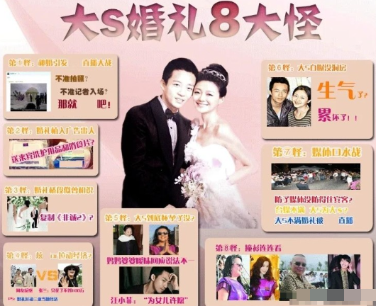 这还不算完,被狂风侵袭、被张朝阳直播婚礼,这些都不是最抓马的。当年张兰为了出“风头”,还以帅气的形象来了段架子鼓。其他宾客也没闲着,黄晓明迟到、高晓松在台上长篇大论、那英张惠妹台上彪歌曲台下拼酒、刘谦表演魔术不成反倒被推进泳池,情况一个比一个抓马。甚至就连伴手礼和伴娘服也出了问题,让大 S 陷入了抄袭风波。这些事儿让她的婚礼变成了一场闹剧,甚至还忘了拍婚纱照。