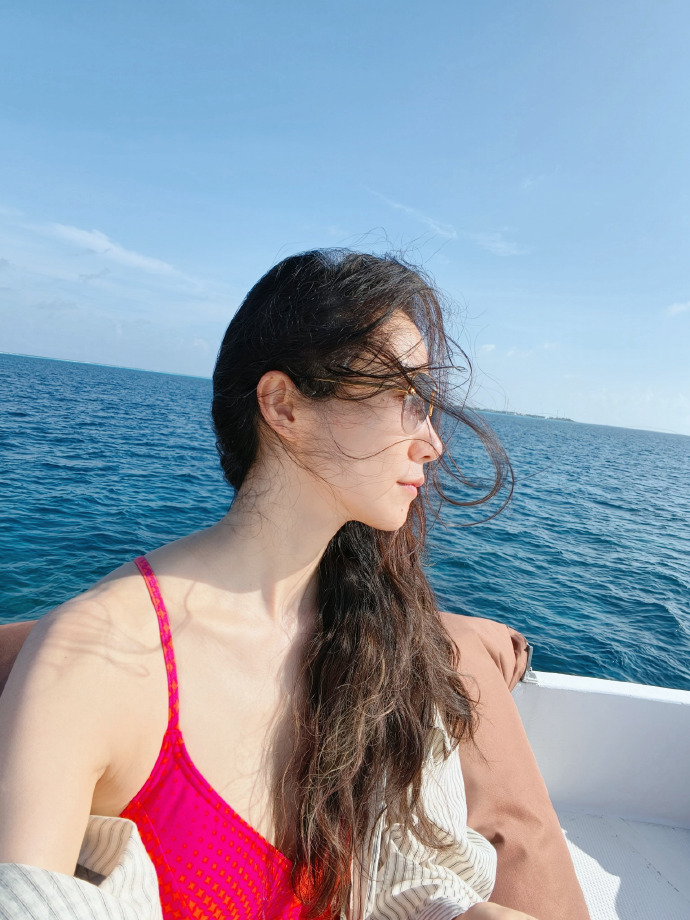 她坐在船舷的座位上,红吊带的线条贴在肩颈,长发顺着船沿垂落,眼神往海面偏了半分。平时她的坐姿常带着舒展的优雅,腰背会自然挺直。可这次她的腰背松了点弧度,连长发蹭在船沿都没管,是被海面的蓝勾走注意力的松弛,没了平时的分寸感。冬寒里的这抹暖,倒让她的状态比平时更软了些。