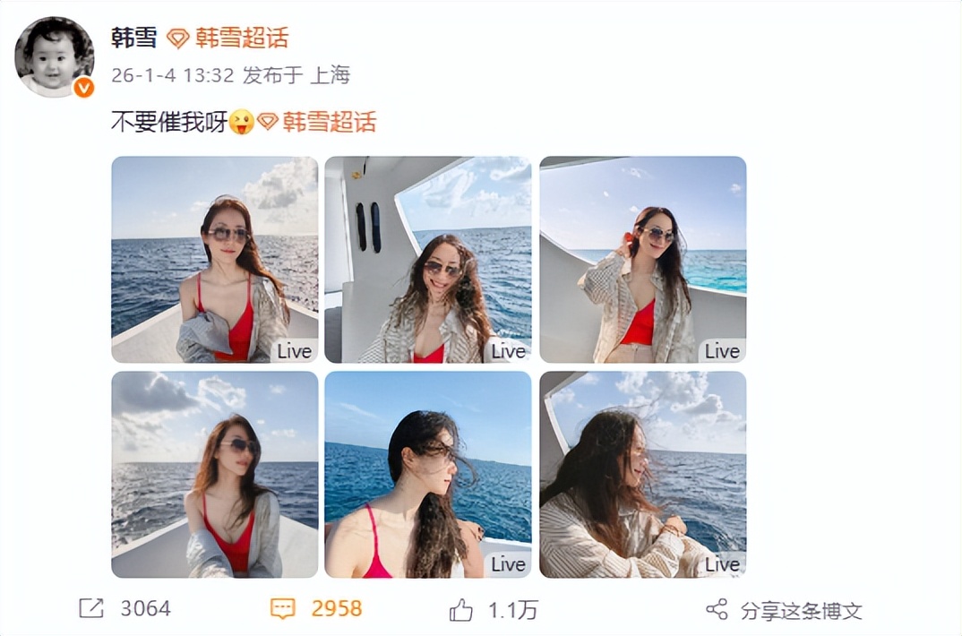 现在正裹着厚外套踩碎雪的季节,国内多数城市都浸在冬寒里,连出门都要裹紧围巾的冷,却在韩雪发的这条动态里,撞见了满屏的海风与热意。她穿得清简,红吊带衬着海面的蓝,一看就是往暖得不用裹外套的地方跑了,这次配文 “不要催我呀”,把海上的风揉进红吊带与薄外套的搭配里,是卸下精致分寸后的松弛。