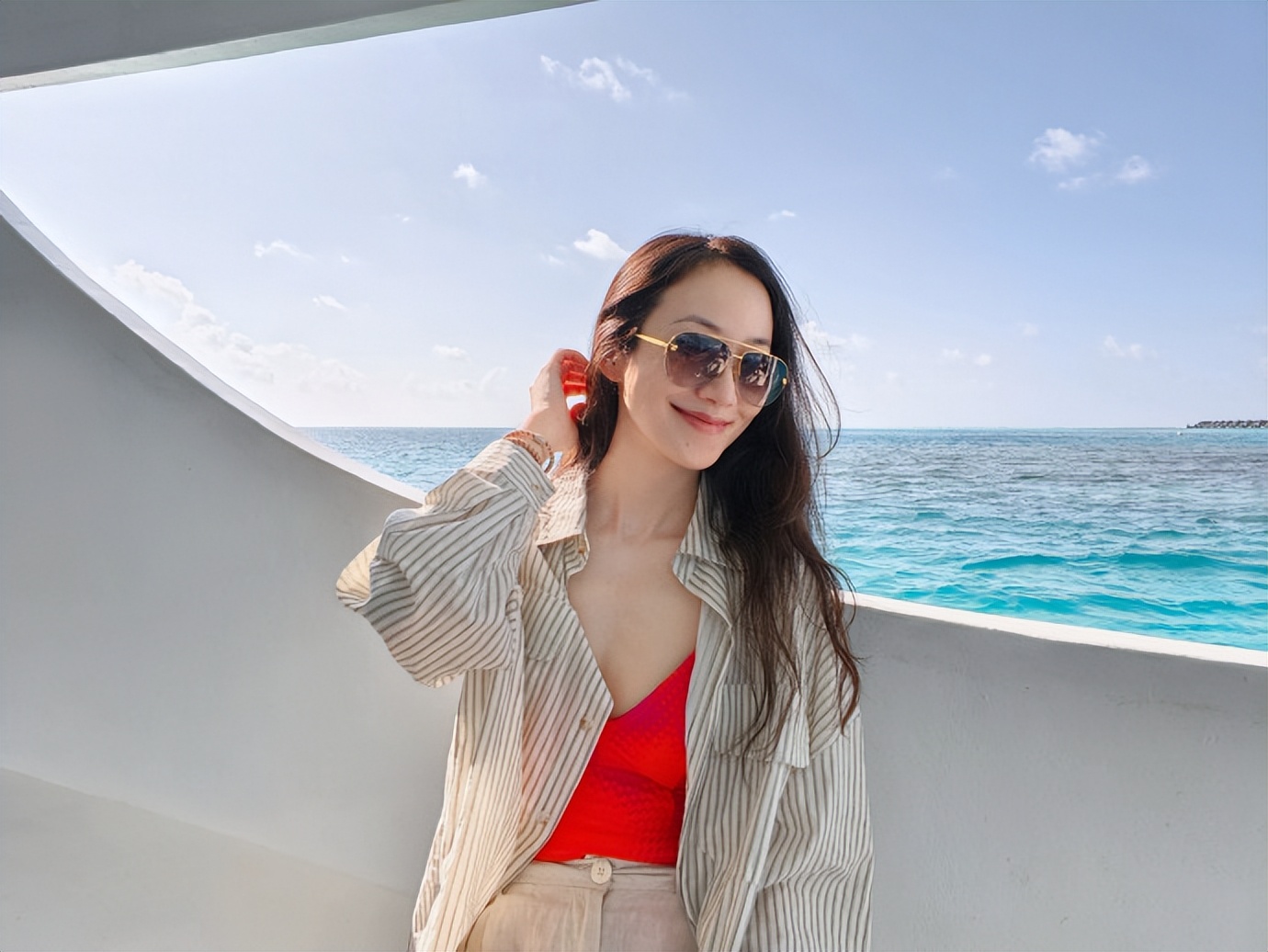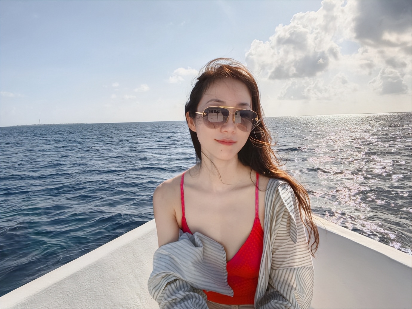 她站在船内,红吊带的肩带衬着肩线,长发被海风吹得往身后扬,墨镜遮了半张脸。平时她的造型会避开 “凌乱感”,风大时总会把头发拢到耳后。可这次她由着头发被吹扬,连肩带的位置都没调整,是把 “造型的规整” 让给了海风的肆意,只跟着风的节奏放松。暖地的风就是不一样,连乱发都裹着开心的劲儿。