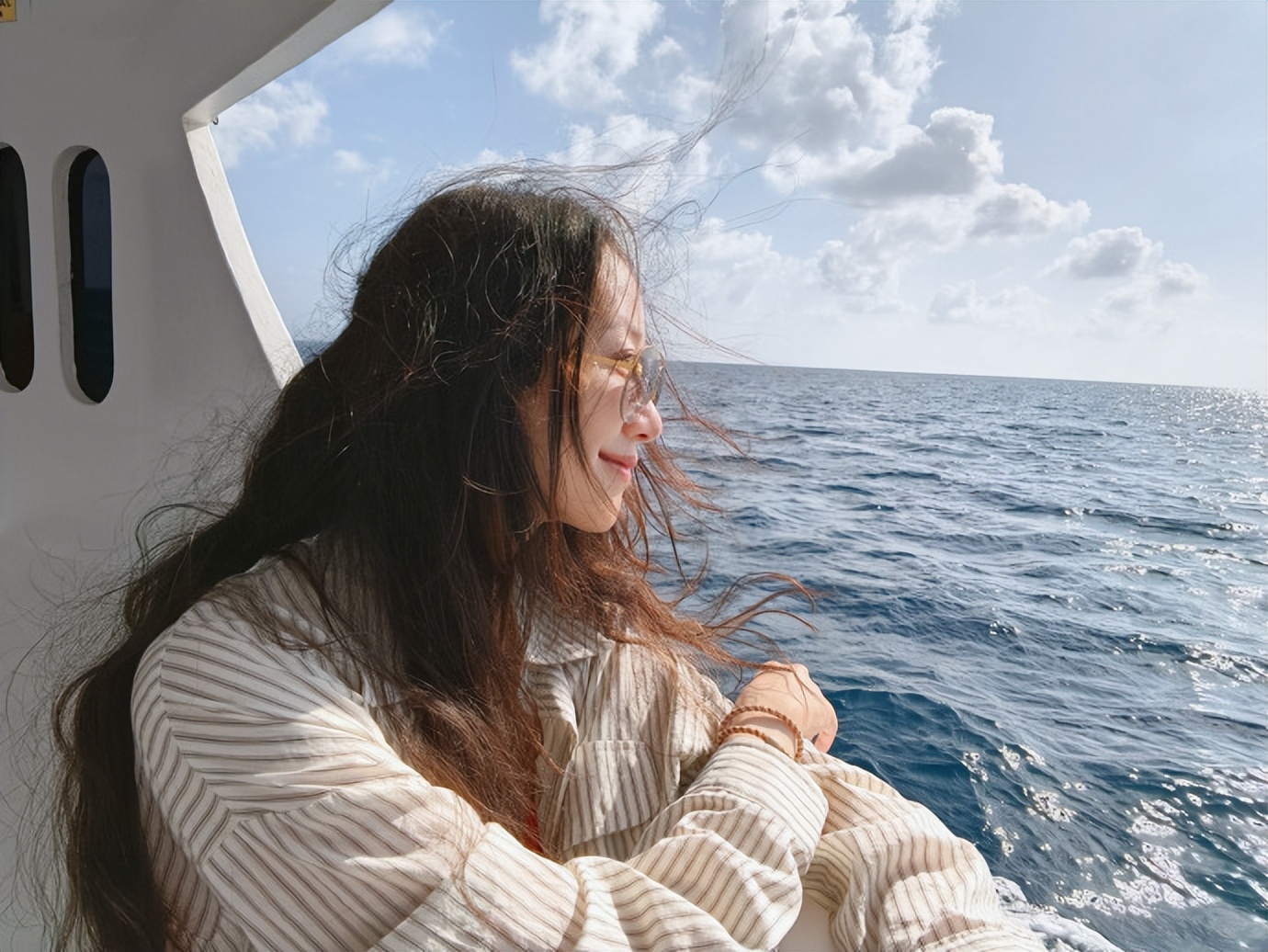 她站在船内,一只手抬着拨乱发,薄外套的袖口滑到小臂,身后的海面蓝得透亮。这组图的角度自然得不像自拍,镜头总跟着她的动作晃半分,倒像是身边有朋友举着手机随手拍的,看来这趟暖冬里的海旅,她不是独自来的,身边该有能一起吹海风、抓镜头的伴。平时她的发型总打理得垂顺规整,风大时也会随手拢好。可这次被海风吹乱的发,她只轻拨了一下,连袖口的滑落都没在意,是被风打乱了精致的自然,没了平时的刻意。