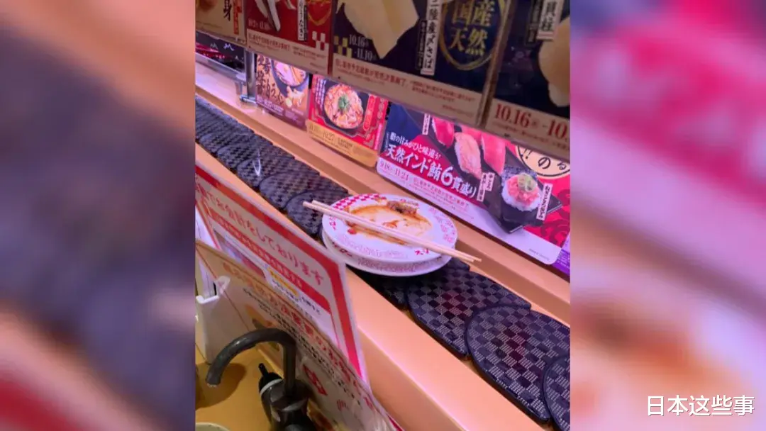 根据日本媒体《富士新闻》报导,10月17日时,一名樱花妹「furo_manji」来到了东京秋叶原的一家寿司郎分店,没想到就在她坐下准备就餐的时候,突然发现转盘的带上源源不断出来使用过的脏盘子,盘子上还放有各种各样的东西,比如用过的筷子,食物的残渣,炸虾的虾尾等,看起来十分倒胃口。