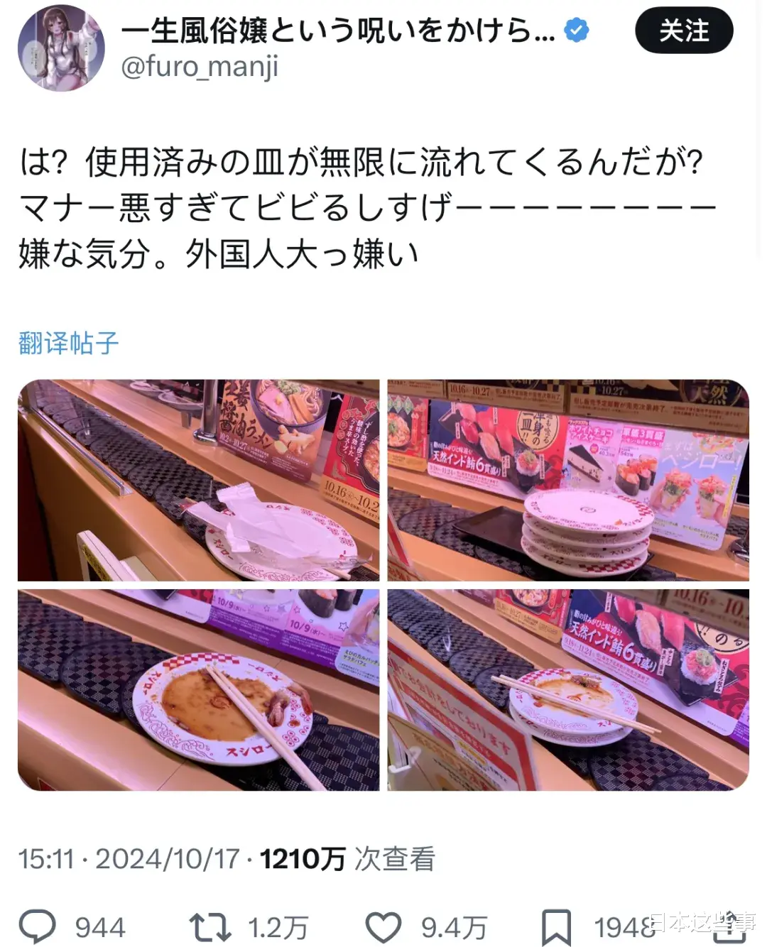 于是这名樱花妹「furo_manji」将现场的图片拍下,并上传到平台X(原推特上),并愤怒的表示「什么意思?用过的脏盘子被无限地流出来,这糟糕的礼仪,真是让人很不舒服,我讨厌外国人。」