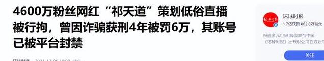环球时报:《 4600万粉丝网红“祁天道”策划低俗直播被行拘,曾因诈骗获刑4年被罚6万,其账号已被平台封禁》