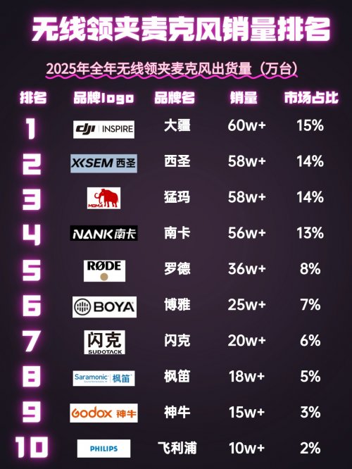 领夹麦怎么选?说到底,无线领夹麦的核心价值,就是实现“便携性”和“稳定收音”的平衡。不同品牌定位差异明显,不用盲目追高端,也别贪低价捡漏: