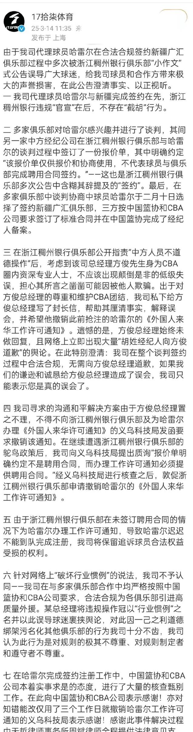 这时候浙江稠州又坐不住了,再次发表一篇文章说自己已经向中国篮协和国际篮联申诉了,提醒新疆队要谨慎签约哈雷尔里面的风险会非常的大。