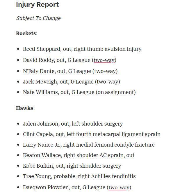 亚特兰大老鹰队此役客场作战,却面临着严重的伤病问题。主力球员杰伦·约翰逊、卡佩拉等人确定缺阵,而球队核心特雷·杨因右跟腱炎出战成疑。再加上普劳登和托平被下放到发展联盟,老鹰队的阵容深度大打折扣。对于火箭队来说,这无疑是一个利好消息。