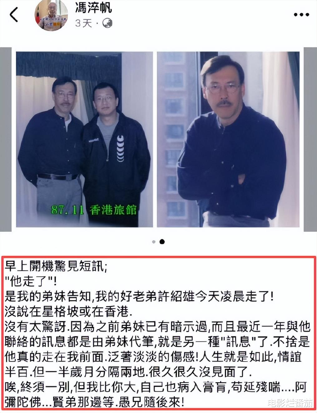 而在不久前,他还曾专门发文悼念过许绍雄,称“贤弟那边等,愚兄随后来”。