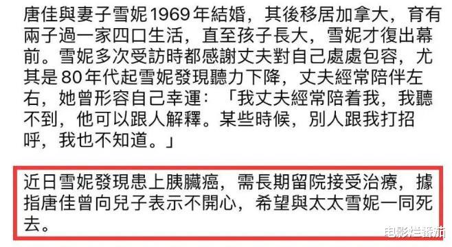 只不过,近些年,她被确诊为胰腺癌,之后就长期接受住院治疗,老公唐佳则是成为其“专属保姆”悉心照料,有爱人相伴虽然痛苦,也有些许温馨。