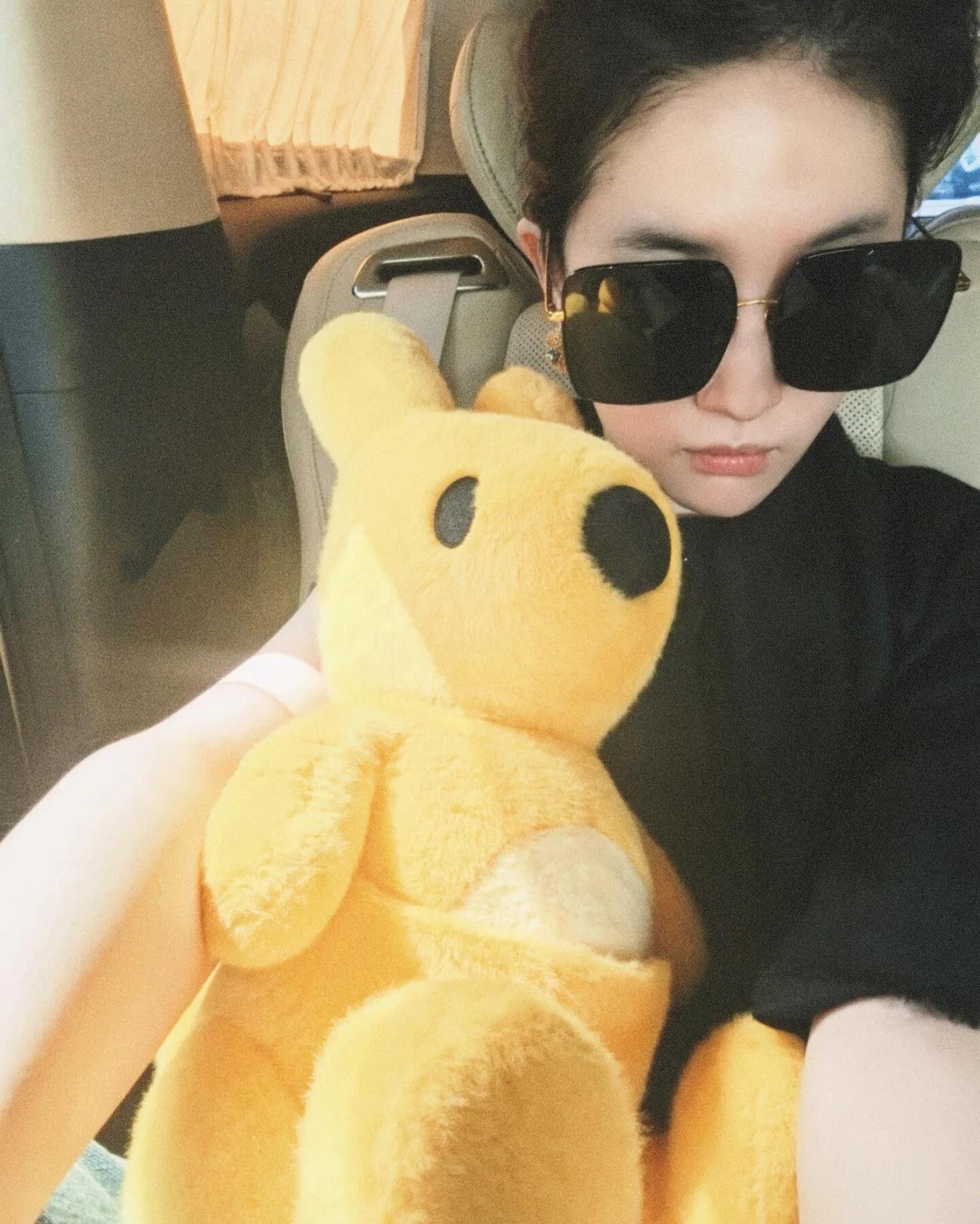 刘亦菲坐在她的豪车里,她穿着黑色高领毛衣戴着墨镜,她打扮的酷酷的,但是她怀里抱着一只黄色大袋鼠玩偶,美团的袋鼠和她很配。