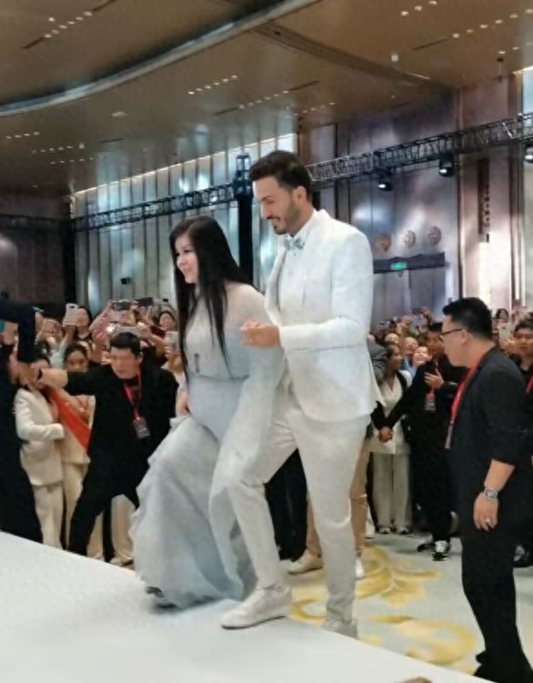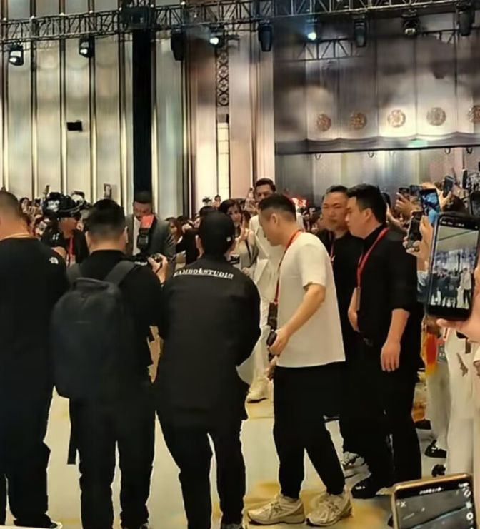 罗兰多则是穿着白色西装亮相,两人相当恩爱,罗兰多全程搂着于文红,搞笑的是,其中有一位男生后腿时,踩歪了,一屁股坐在了地上,场面相当混乱。于文红挥手和大家打招呼,对于这样的场面,估计早已经习惯了。
