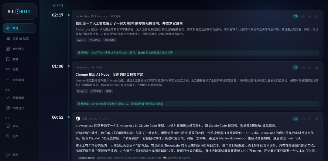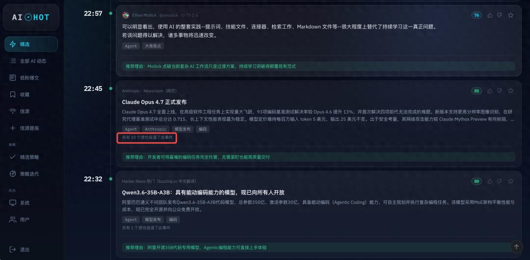 这玩意火到什么程度呢,我自己开发的给公司内部用的全网AI信息监控的产品AIHOT上,监控了精挑细选的几十个有价值的信源,一般一个信息,有3个信源同时报道,就已经比较受关注了。