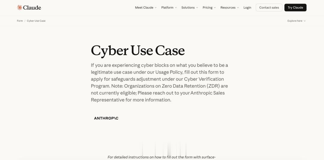 Anthropic开了一个正式的通道,让合法的安全研究、渗透测试、red-teaming可以申请使用Claude的某些原本受限的能力。