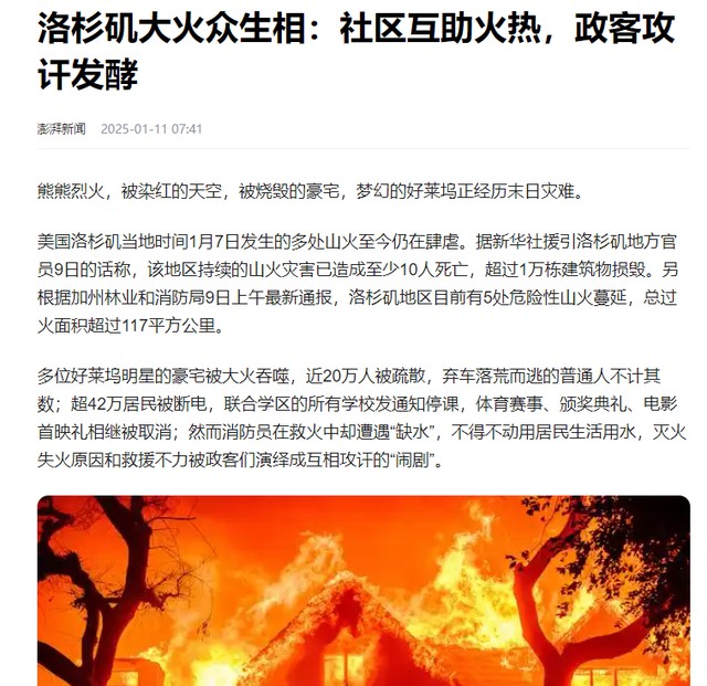 信息来源:澎湃新闻2025.1.11——洛杉矶大火众生相:社区互助火热,政客攻讦发酵