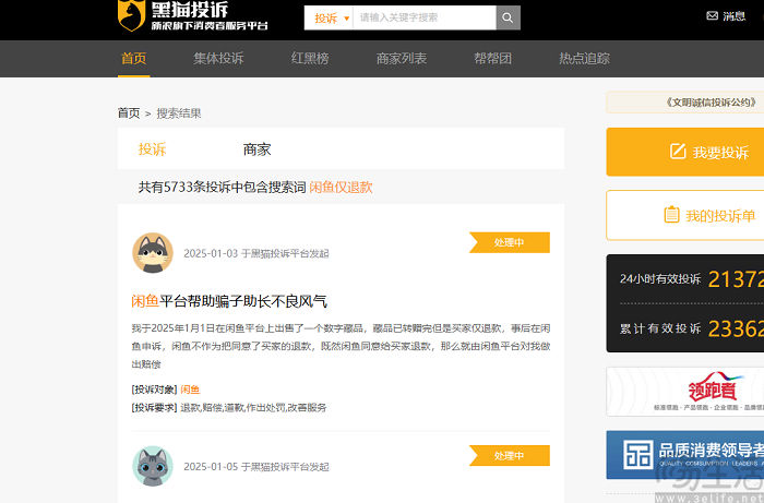 据了解,目前在黑猫投诉平台与闲鱼仅退款相关的投诉超过了5700条,其中大多数是投诉仅退款处理不当、卖家蒙受损失等。而且闲鱼相关的全部投诉已累计近20万条,但其中已回复和完成的投诉仅占极少数。