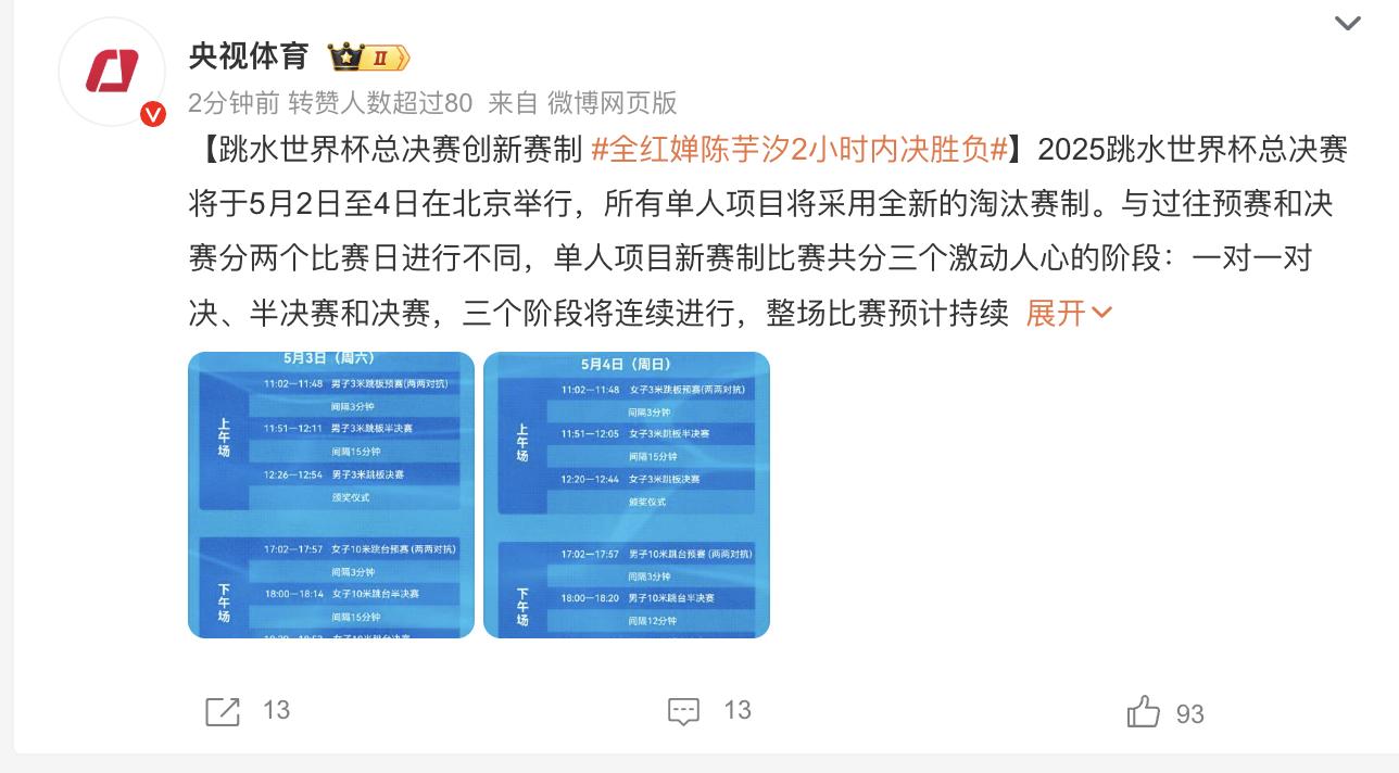 众所周知,目前全红婵已经结束了两站世界杯跳水比赛的争夺,最终都非常遗憾在决赛中发生小小的失误,输给队友无缘站上最高领奖台。在结束了这两站比赛的争夺之后,接下来全红婵和陈芋汐他们将会回到北京,在5月3号参加2025年世界泳联跳水世界杯总决赛,这也将是今年跳水界的重头戏。对于全红婵和陈芋汐他们来说,肯定希望能够在年度总决赛中拿到最有含金量的冠军。