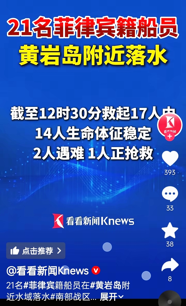 黄岩岛附近海域突发意外,一艘外籍货轮倾覆,21名菲律宾籍船员全部落水,情况十分危急。这一突发事件迅速引起广泛关注,人们都在揪心船员们的安危。