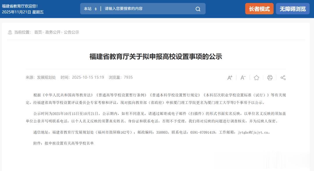 2024年《福建省教育厅关于高等学校设置事项的公示》中公示:厦门海洋职业技术学院拟升格为公办本科院校,更名为厦门海洋职业大学。