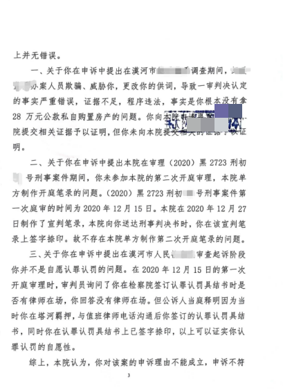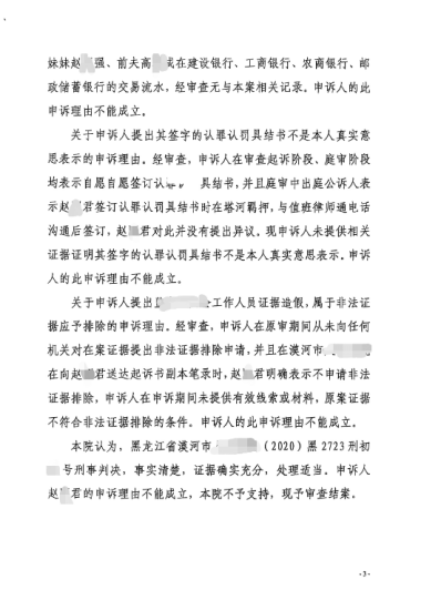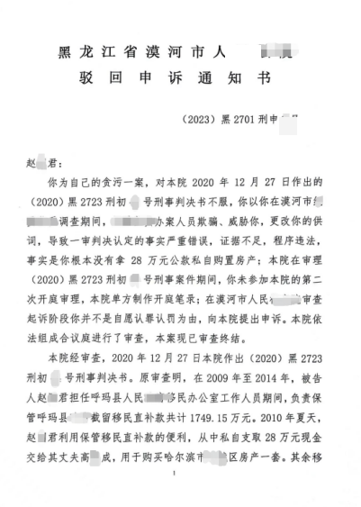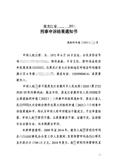 2025年1月,赵某君向黑龙江省检察机关提交监督申诉,请求启动再审程序改判无罪。她强调,认定其贪污的关键证据存在疑问,资金流转事实未查清,案件符合重新审查的条件。然而,2025年11月28日,赵某君却收到黑龙江省检察机关于 11月 11 日印发的驳回通知书。她强调,黑龙江省各级检察机关受理其刑事申诉案件过程中,未召开任何形式的听证会。