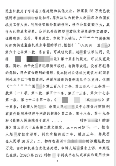 2020 年 9 月,漠河市监察部门以涉嫌贪污为由对赵某君采取留置措施,指控其于2010年夏天利用职务便利,私自支取 28 万元现金交给丈夫高某成,用于购买哈尔滨市某城区房产一套。同年 12 月,漠河市相关法院适用简易程序审理后作出判决,认定赵某君犯贪污罪,判处有期徒刑二年、缓刑三年,并处罚金十万元,涉案 28 万元被依法扣押。