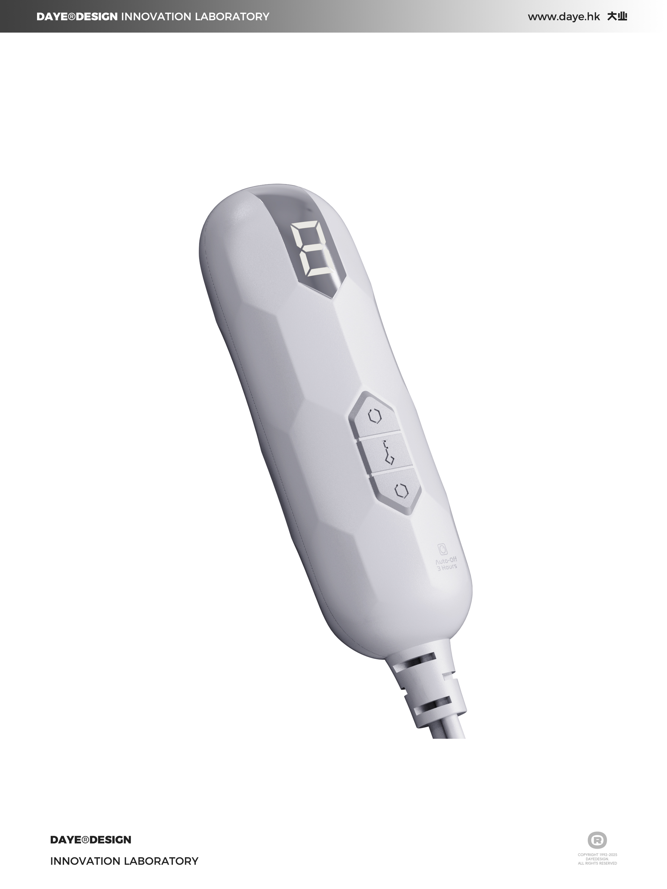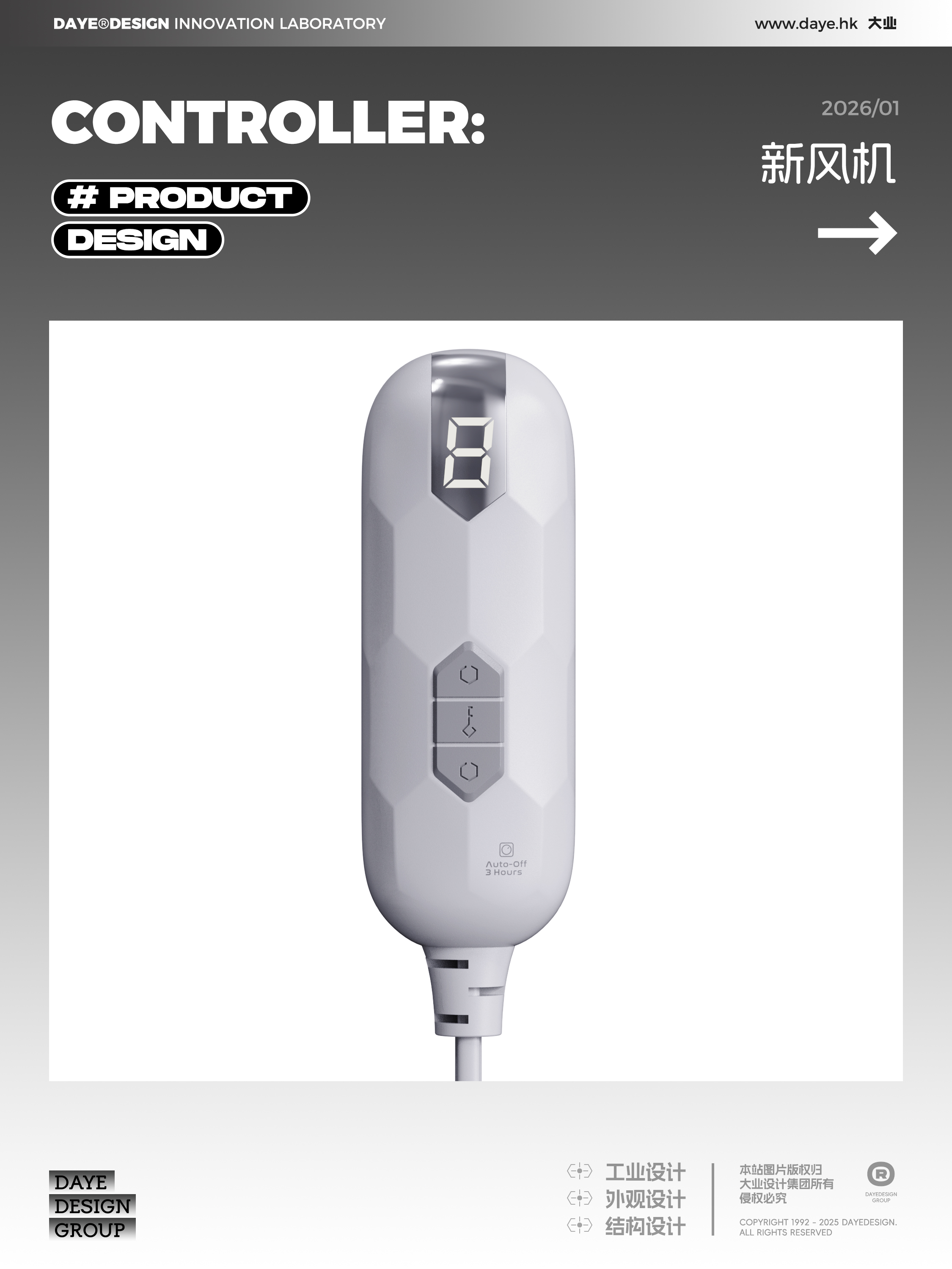整体遵循椭圆曲面 + 几何切割的一体化造型,椭圆曲面的主体形态贴合手掌弧度,保障长时间握持的舒适度;表面的几何切割纹理既消解了圆润形态的单调感,又通过凹凸纹理提升握持摩擦力,避免手滑;上窄下宽的比例设计,既让顶部显示屏的视角更舒适,又为底部接线预留合理空间。