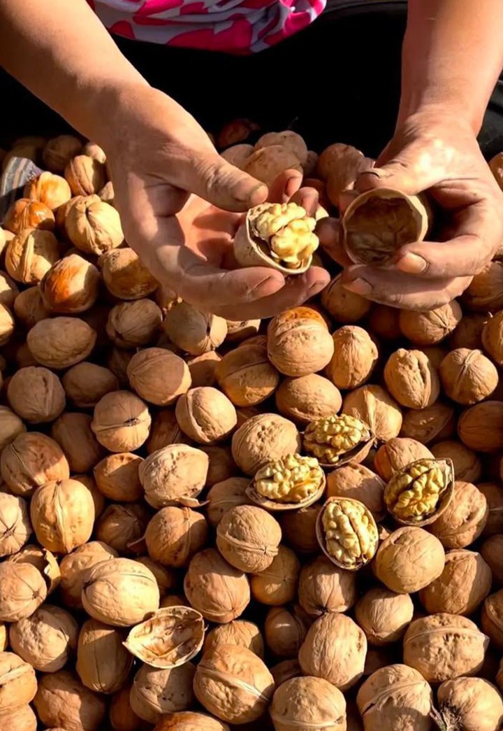 "你看这沙质土壤,"小李蹲在地上,抓起一把土摊开,"它的透气性很好,但保水性差,就像个漏斗。"他指着远处连绵的山丘说,"这里的昼夜温差大,白天阳光充足,晚上温度骤降,这种环境最有利于糖分的积累。"正说着,他顺手掰开一颗刚摘下的核桃,露出金黄色的果仁,"闻闻这香气,是不是比超市里卖的更浓郁?"