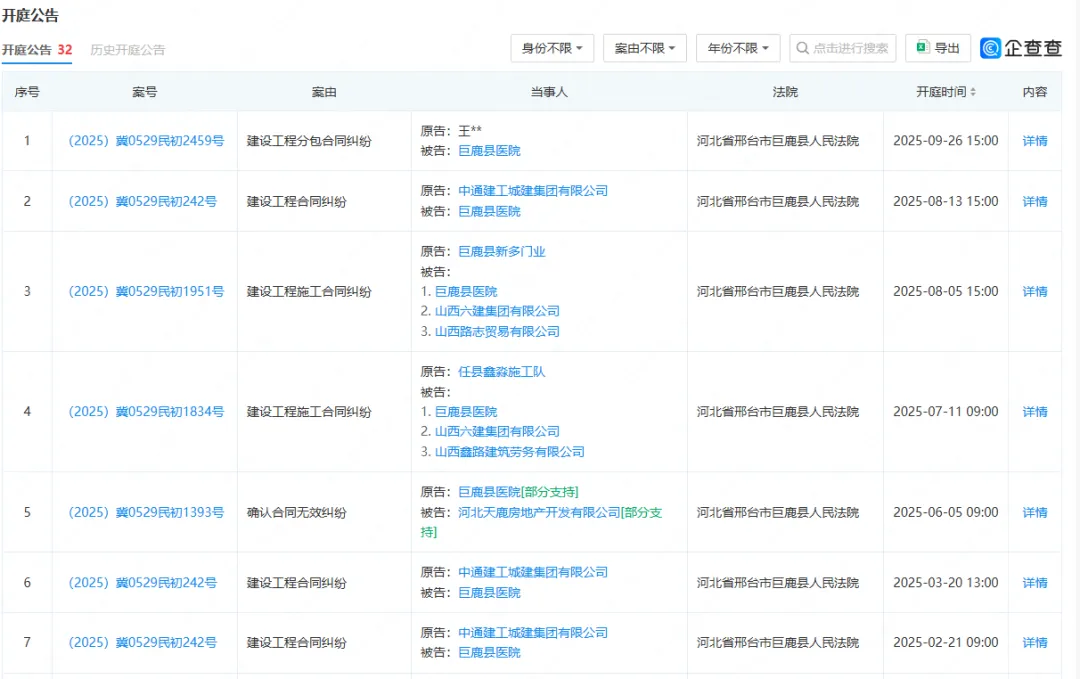 此外,据企查查公开信息显示,巨鹿县医院近一年来官司“缠身”,涉及多起司法案件,且以民事案件为主,案由包括建设工程分包合同纠纷、建设工程合同纠纷、建设工程施工合同纠纷、确认合同无效纠纷等。