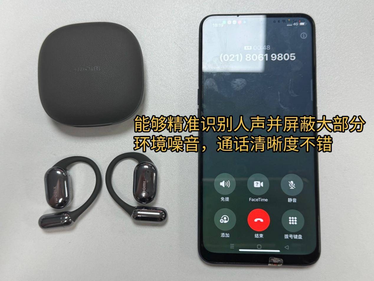 耳机内置双麦克风阵列,并搭载 AI 通话降噪算法,能够精准识别人声并屏蔽大部分环境噪音,保证通话清晰度。实测显示,在地铁、街头或户外运动等嘈杂场景下,对方依然可以清楚听到通话内容。整体通话质量稳定出色,是当前开放式耳机中通话表现较为突出的机型之一。