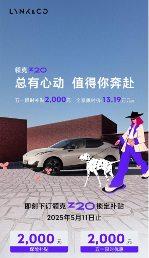 在价格方面,领克Z20也充分考虑了年轻消费者的经济能力。根据领克官方政策,在特定时间内购入领克Z20,可以享受多重优惠。例如,用户在5月11日前购入领克Z20,可享受2000元的保险补贴和2000元的五一限时优惠,全系限时价仅13.19万起。如果再叠加20000元国家以旧换新补贴、4000元增购补贴、2000元领克大客户优享补贴,官方定价13.59万的领克Z20后驱Pro版,最低仅需10.59万即可入手。