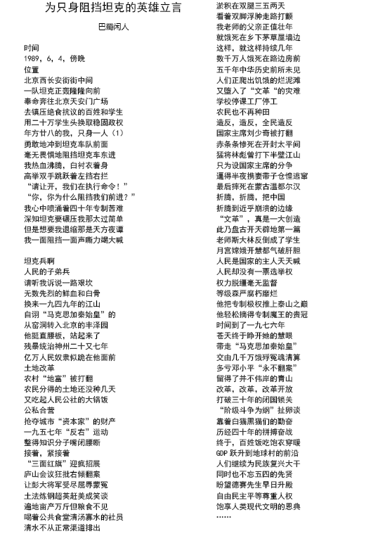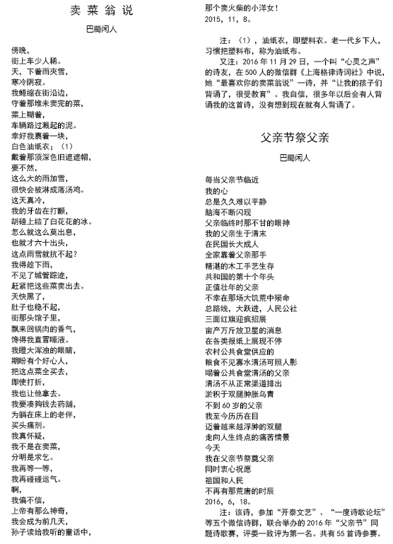 代表作:《卖菜翁说》、《父亲节祭父亲》、《母亲拔牙,肉跳心惊》、《慢慢地陪着你走》、《难忘故乡的小路》、《奉节断想》、《休说盛唐》、《戏说孔子》、《白话“省委别墅”》、《啊,祖先》、《黄金树赞》、《斗士,乔尔丹诺.布鲁诺》、《千年后人读今诗》、《“蒲松龄讲习班”夭折梦中》、《梦亦真,真亦梦》、《我的同胞,我的最爱》等,已广为诵传。